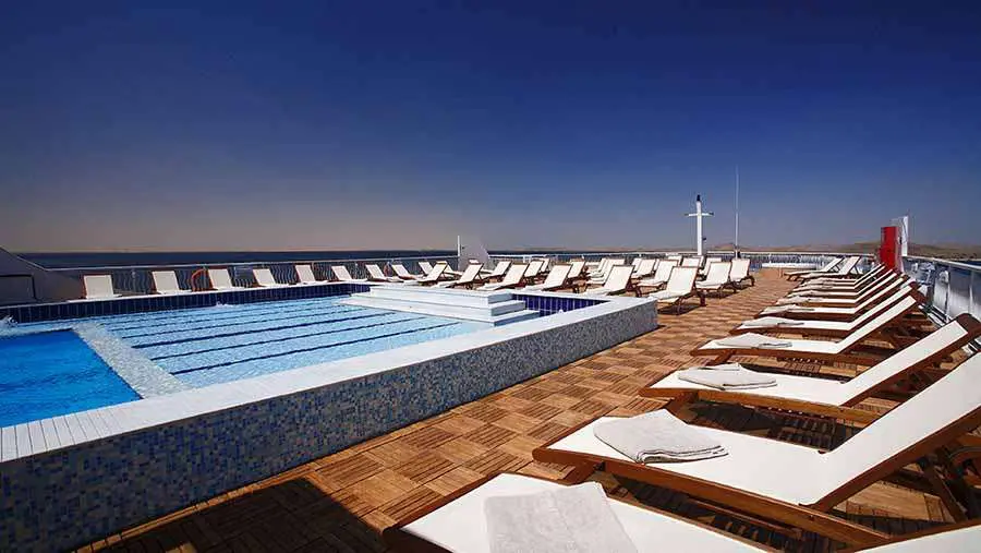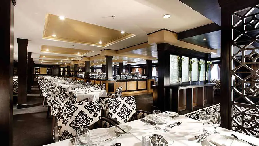 The ship’s main Abu Nawas restaurant will accommodate all passengers at a single sitting serving gourmet class cuisine.  Passengers can also take their ease and reflect in the luxurious Bashawat or Mamlouk lounge bars.  The SteigenbergerOmar El Khayam has lots of facilities onboard for relaxation and entertainment, many of which can be reached by the vessels own elevator system.  These facilities include a billiard roon, a large Sundeck with pool, Jaccuzi and a pool bar in addition to the Cleopatra Spa  including Jacuzzi, Health club with a high tech fitness studio and three individual massage rooms.